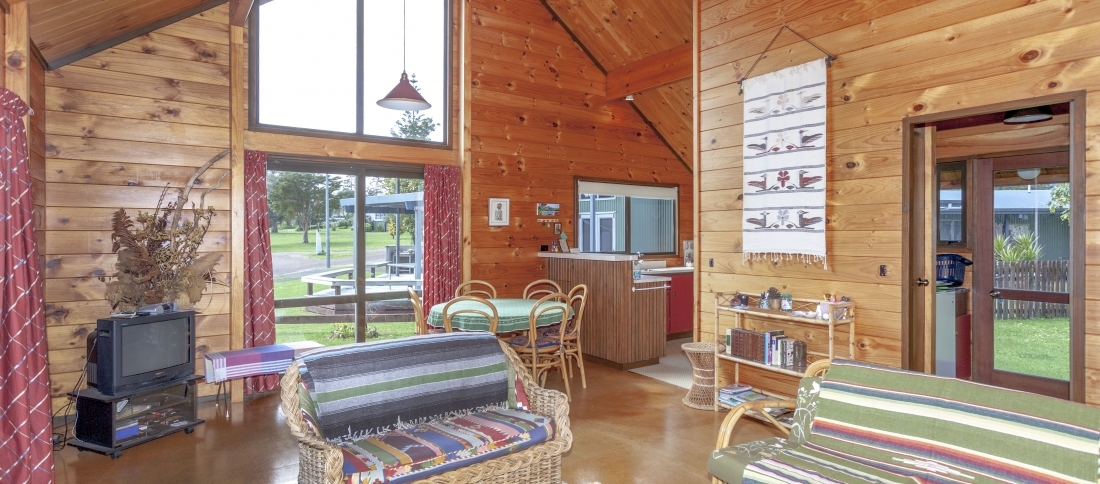 Open plan kitchen / dining and lounge flow to front deck with unobstructed harbour views. The interior is solid wood panellng characteristic of Lockwood homes and has the potential to modernise by blonding or painting.