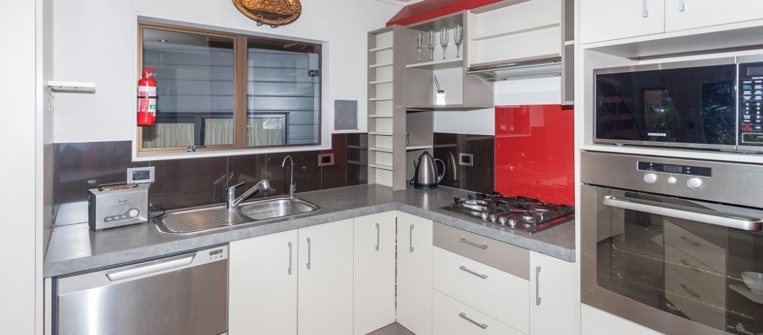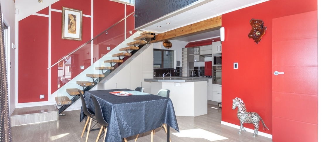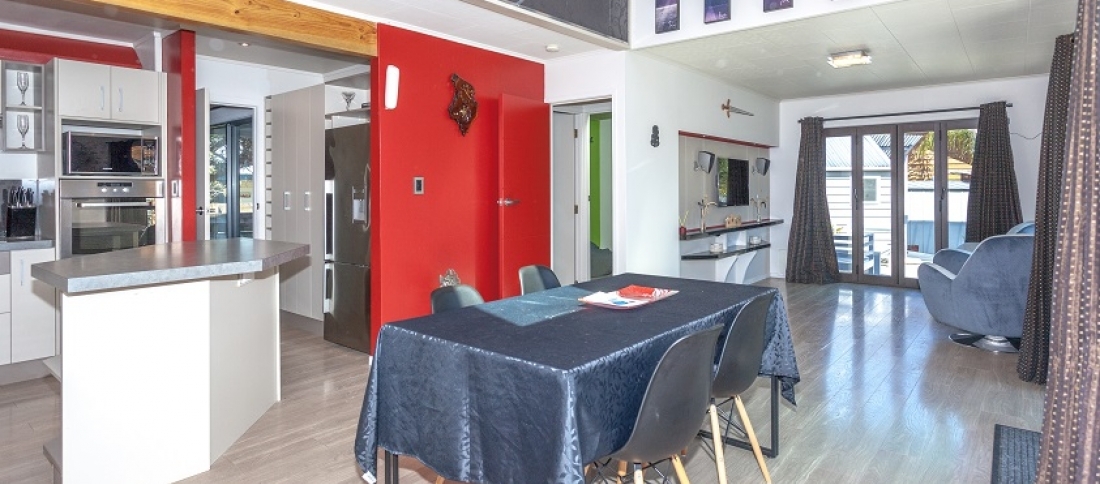 Main living area on the lower floor with modern kitchen opens via bifold doors to large sheltered deck. Also on the ground floor is a double bedroom, bathroom and office space, adjoining this is a large space previously used as a commercial kitchen and easily reinstated. Another storage area and 7 meter single garage/workshop with a 3 meter stud.