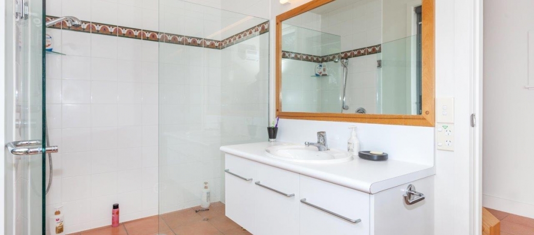 3 double bedrooms, each with their own en-suite or adjacent bathroom. The master is separate and private with walk in wardrobe and storage and a lovely balcony with beautiful ocean views.